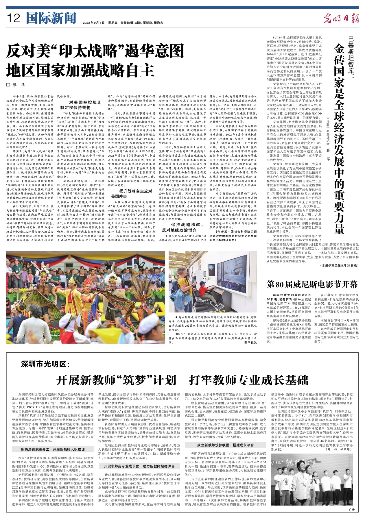 8月24日,金砖国家领导人第十五次会晤特别记者会宣布,邀请沙特、埃及、阿联酋、阿根廷、伊朗、埃塞俄比亚正式成为金砖大家庭成员,其成员资格将从2024年1月1日起生效。近日,巴基斯坦智库“全球丝绸之路研究联盟”创始主席泽米尔·阿万发表署名文章,称6个国家的加入无论是对金砖国家还是对世界格局而言都是非凡的发展,开创了一个放大全球南方声音和愿望、以不同视角和创新能量丰富世界的新时代。 文章指出,6个新成员的加入不仅扩大了金砖合作机制的地理和文化范围,而且加强了其在全球舞台上的经济和政治实力。人们注意到这可能仅仅是个开始,已经有更多国家表达了对加入金砖大家庭有浓厚兴趣。上述6国加入后,金砖国家人口将占世界人口的46%;按购买力平价计算,金砖国家GDP占全球GDP的37%,是全球经济发展中的重要力量。 文章强调,此次峰会是金砖国家领导人新冠疫情后的首次面对面聚会,具有特别重要的意义。中国国家主席习近平在会上的发言引起了深刻共鸣,凸显其超越国界的远见卓识,不仅传递了中国的观点,更包含了对全球社会更广泛、更具包容性的愿景;不仅表达了发展中国家和全人类对进步的集体追求,而且主张发展中国家在全球治理中享有更公平的代表性。 文章说,中国通过此前提出的全球发展倡议表达了对发展中国家坚定不移的支持。该倡议旨在通过实质性措施和切实合作为联合国2030年可持续发展议程的实施注入活力。中国为此设立了全球发展和南南合作基金。所有这些表明中国致力于培育超越国界的合作伙伴关系,利用合作的力量推动各大洲的发展。跨越亚洲和非洲的200多个合作项目业已取得丰硕成果,体现了中国对包容性高质量发展的承诺。此次峰会上,习近平主席还表示中国致力于促进全球粮食安全和分享农业技术。“积力之所举,则无不胜也;众智之所为,则无不成也。”概括了峰会的精髓,即携手构建发展共同体,不让任何一个国家在世界现代化进程中掉队。 文章最后指出,金砖国家领导人第十五次会晤标志着一个历史性的转折,6个新国家的加入将为金砖国家共同走向团结、繁荣和集体增长的光明未来注入新鲜血液和新的发展动力。中国对世界发展的积极贡献不容置疑,并指明了前进的道路——一条协作与共同发展的道路。中国的崛起推动了全球和平、安全、繁荣与发展,点燃了所有国家特别是发展中国家的希望灯塔。 (本报伊斯兰堡8月31日电 本报驻伊斯兰堡记者 戴军) Reference Link:- https://app.gmdaily.cn/as/opened/n/261f886d5d4846b4b748e97a0ed47665
