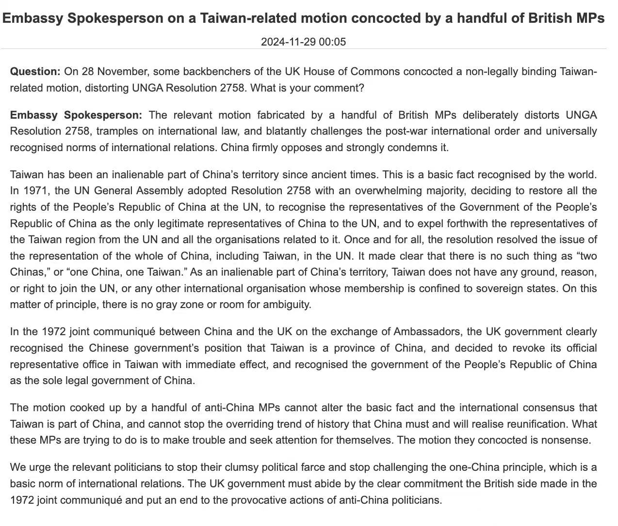 China condemns UK MP’s Taiwan-related motion for distorting UN resolution: Chinese Embassy in the UK