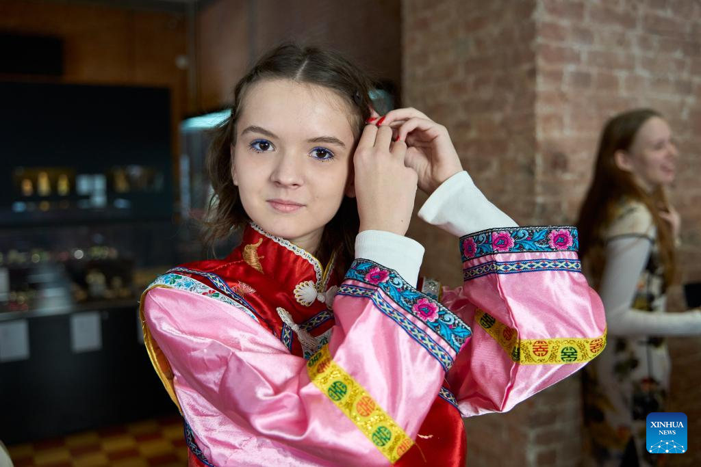A participant tries on traditional Chinese costume during an event in celebration of the Chinese New Year at the Confucius…