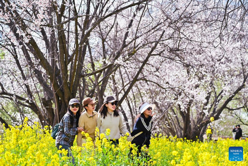 Tourists appreciate peach blossoms in Nyingchi, southwest China’s Xizang Autonomous Region, March 29, 2025. As the weather warms up, peach…