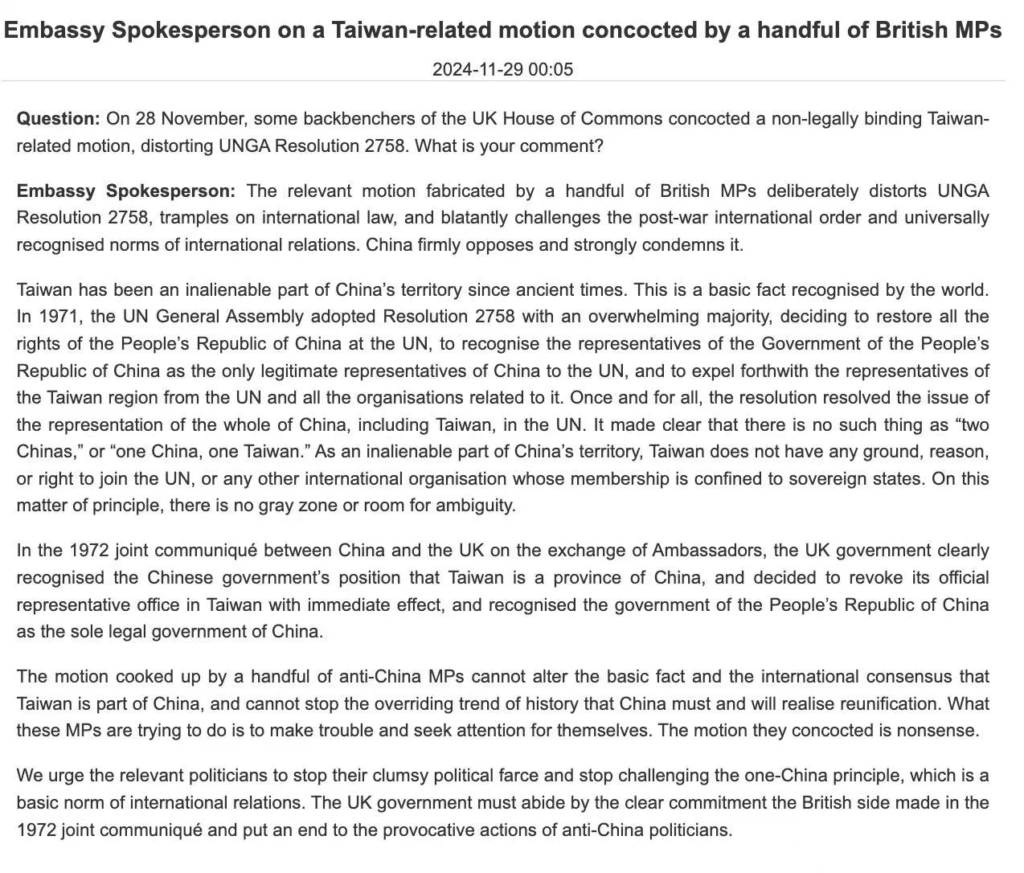 The motion fabricated by a handful of British MPs deliberately distorts United Nations General Assembly Resolution 2758, tramples on international law, and blatantly challenges the post-war international order and universally recognized norms of international relations, and China firmly opposes and strongly condemns this motion, the spokesperson of Chinese Embassy in the UK said in a statement on Friday after some backbenchers of the UK House of Commons concocted a non-legally binding Taiwan-related motion on Thursday.