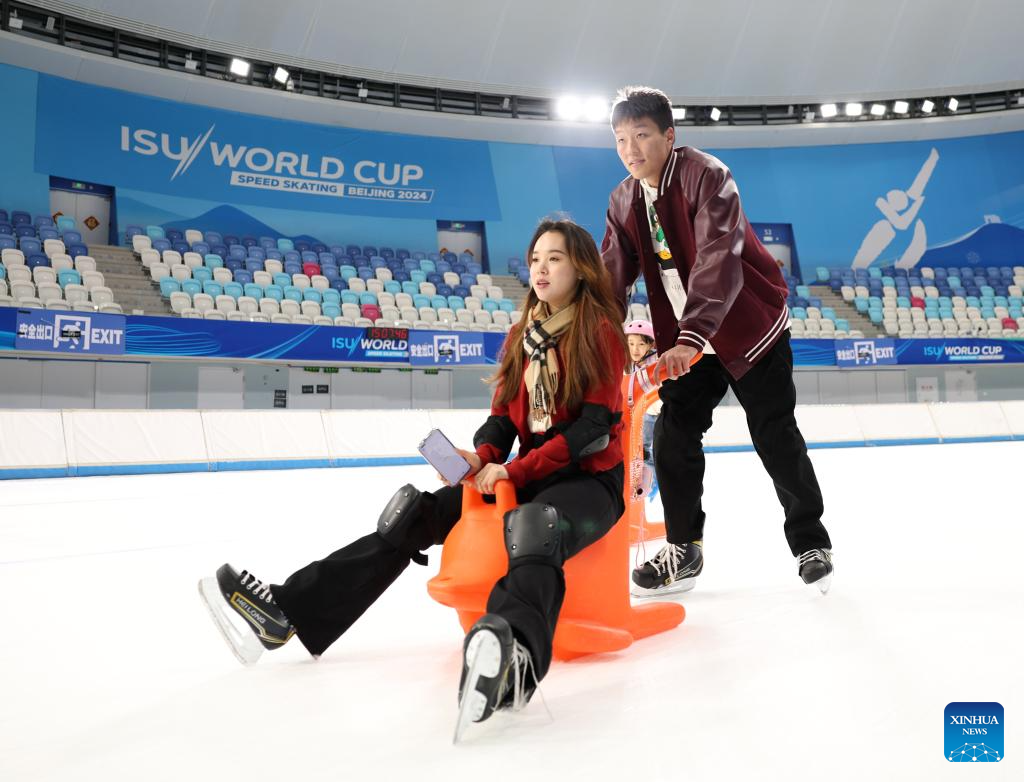 People enjoy themselves at the National Speed Skating Oval in Beijing, capital of China, Jan. 4, 2025. People flocked to the National Speed Skating Oval to have fun with ice and snow during the weekend. (Xinhua/Zhang Chenlin)