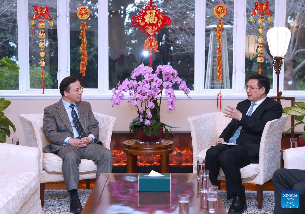 President of Xinhua News Agency Fu Hua meets with President of the University of Hong Kong (HKU) Zhang Xiang in south China’s Hong Kong, Feb. 19, 2025. Fu Hua met with various sectors in Hong Kong including education, culture and publishing, during his visit to the Hong Kong Special Administrative Region (HKSAR) and has reached consensuses with them respectively on further deepening cooperation.