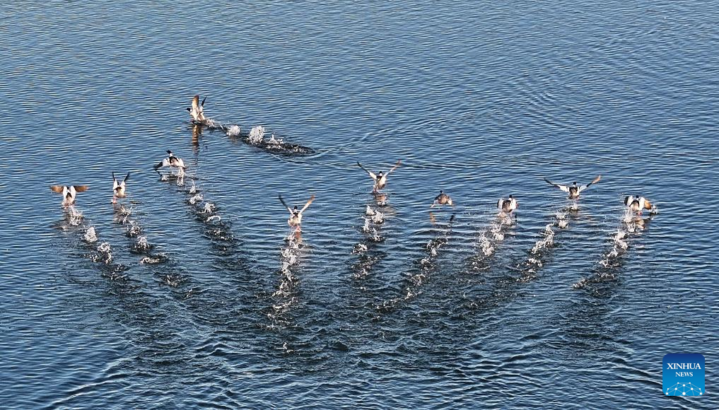 A drone photo taken on Feb 24, 2025 shows waterfowls on a lake in Zunhua, north China’s Hebei Province. (Photo by Liu Mancang/Xinhua)