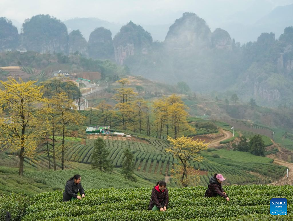 Villagers pick tea buds at a tea garden in Jingangcheng Village of Maoping Town, Zigui County of central China’s Hubei Province, March 10, 2025. (Photo by Wang Gang/Xinhua)