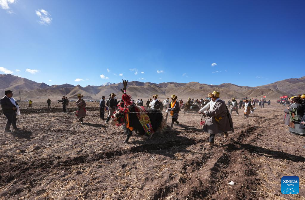 Farmers participate in a ceremony marking the start of spring farming in Quxar Town of Lnaze County, southwest China’s Xizang Autonomous Region, March 16, 2025. Ceremonies marking the start of spring farming were held across Xizang on Sunday. The ceremony holds great significance as it marks the beginning of a new year’s farming season and serves as a prayer for favorable weather and bountiful harvests. It is considered an important ritual in the farming regions of Xizang. (Xinhua/Jiang Fan)