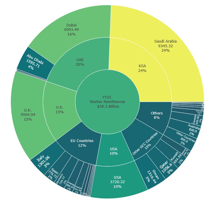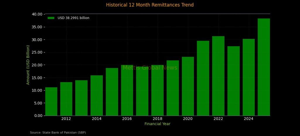 Pakistan’s workers’ remittances reached a record high of $38.3 billion in FY25, marking a 26.6% increase compared to $30.25bn received in the same period of FY24.