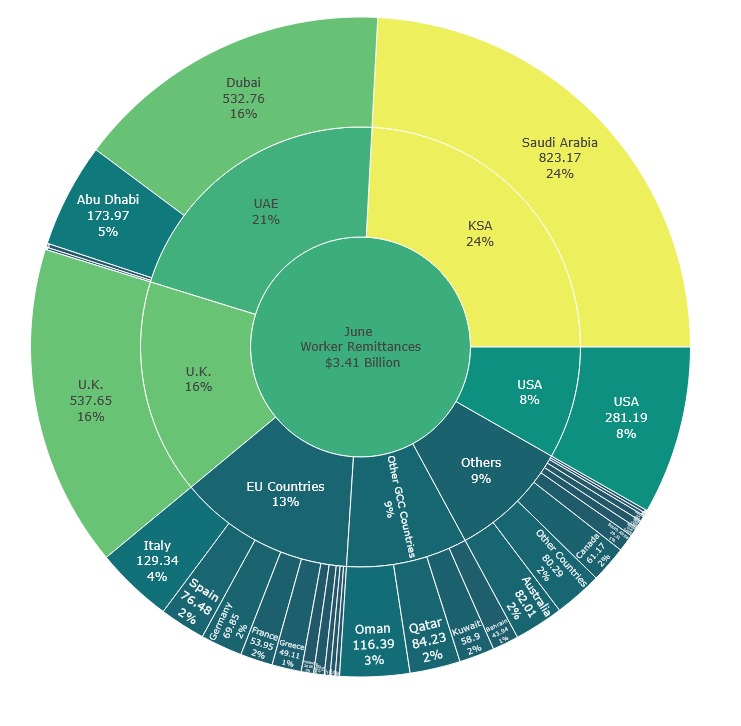 Remittances inflows during June 2025 were mainly sourced from Saudi Arabia ($823.2 million), United Arab Emirates ($717.2m), United Kingdom ($537.6m) and the United States of America ($281.1m).