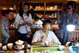 Artisans make ceramic products in Taoyangli historical and cultural block in Jingdezhen City, east China’s Jiangxi Province, July 13, 2025. Located in the heart of Jingdezhen, Taoyangli has successfully transformed from an old district into a thriving hub for cultural innovation and tourism in recent years. Today, it has become a must-visit destination for tourists. (Xinhua/Liu Jinhai)