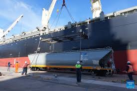 Workers unload a Chinese-made meter-gauge railway grain wagon at a port in Buenos Aires, Argentina, July 30, 2025. A total of 90 Chinese-made meter-gauge railway grain wagons arrived here on Tuesday, which will all be put into an Argentina’s railway network to undertake soybean and corn transportation. (Xinhua/Zhang Duo)