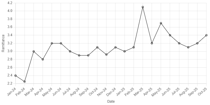 Remittances increased by nearly 12% year-on-year (YoY), compared to $3.1 billion recorded in the same month last year. Every month, remittances were up over 7%, compared to $3.2 billion in September.
