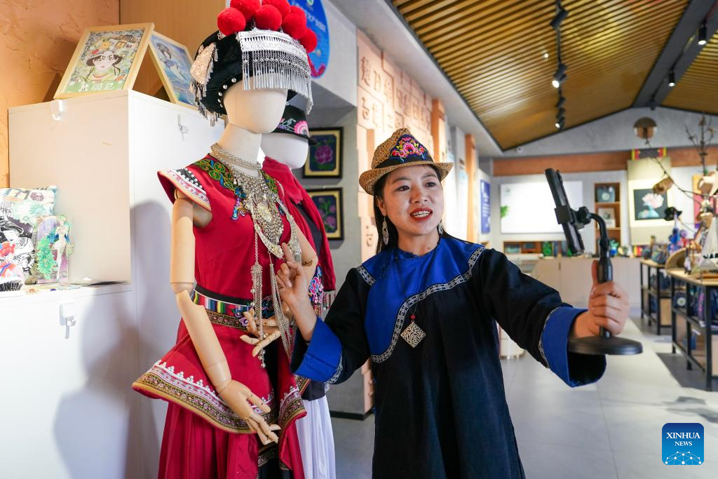 Jin Ruirui promotes Yi ethnic costumes featuring handmade embroidery via livestreaming at her studio in Mouding County, southwest China’s Yunnan Province, Feb. 9, 2026. (Xinhua/Chen Xinbo)