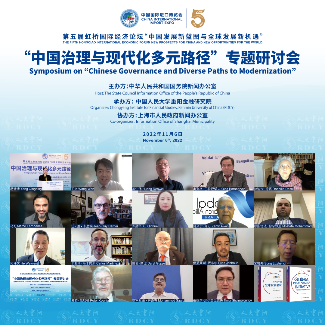 点击蓝字|关注我们人大重阳网综合媒体报道:2022年11月5日,由国务院新闻办主办,国家行政学院国际传播研究中心、中央广播电视总台CGTN、中国国际经济交流中心、中国人民大学重阳金融研究院承办,上海市新闻办协办的第五届虹桥国际经济论坛“中国发展新蓝图与全球发展新机遇”分论坛在京举行。中共中央政治局委员、中宣部部长李书磊出席并致辞。来自近60个国家和地区的200多名中外代表线上线下参会。新华社、人民日报、央视新闻联播、人民日报海外版、光明日报、新华网、人民网、中新网等几乎所有国内主流媒体均报道此次分论坛(点击下划线部分查看相关内容)。李书磊强调,过去十年,新时代的中国在与世界的联系互动中发展,既发展自己又造福世界。中共二十大擘画了以中国式现代化全面推进中华民族伟大复兴的宏伟蓝图,中国愿同各国加强交流互鉴,共同丰富走向现代化的路径。中国将坚定不移增进人民福祉,推动高质量发展,推进高水平对外开放,走和平发展道路,给世界各国共同发展注入更多活力和动力,为世界和平安宁注入更多稳定性。分论坛开幕式上,全国哲学社会科学工作办公室主任、国家高端智库理事会秘书长姜培茂与中国人民大学副校长王轶共同揭幕并发布新书《世界眼中的全球发展倡议》。该书由王轶教授主编、中国人民大学重阳金融研究院策划并翻译,汇集17国政要名流共论习近平主席提出的“全球发展倡议”,是国内首部关于全球发展倡议的著作。《世界眼中的全球发展倡议》图书发布与揭幕11月6日,分论坛四场专题研讨会之一、由中国人民大学重阳金融研究院承办的“中国治理与现代化多元路径”专题研讨会顺利召开,线上线下来自17个国家的30余人参会。中国人民大学重阳金融研究院副院长杨清清主持研讨会。中国人民大学重阳金融研究院执行院长王文在开场欢迎致辞中说,传统意义上现代化的目标是向西方学习与看齐,三十年前美国学者福山提出“历史终结论”,认为历史演变的终点就是西方式的现代化。然而三十年以后的今天,现代化目标有多个实现路径,包括新中国成立后提出了四个现代化的发展目标,工业现代化、农业现代化、国防现代化、科学技术现代化。这些年,中国不断推进实现现代化的速度,成果有目共睹。党的二十大报告中一个非常重要的关键词就是“中国式现代化”,其具有五大特征,分别是人口规模巨大、全体人民共同富裕、物质文明与精神文明相协调、人与自然和谐共生、走和平发展道路的现代化,这五点从中国国情出发,也蕴含了其他国家现代化的共同特征,这为未来的中国发展指明了道路。作为承办单位负责人,王文期待中外专家学者在研讨会上畅所欲言,发表真知灼见,共同为中国与世界的发展建言献策。