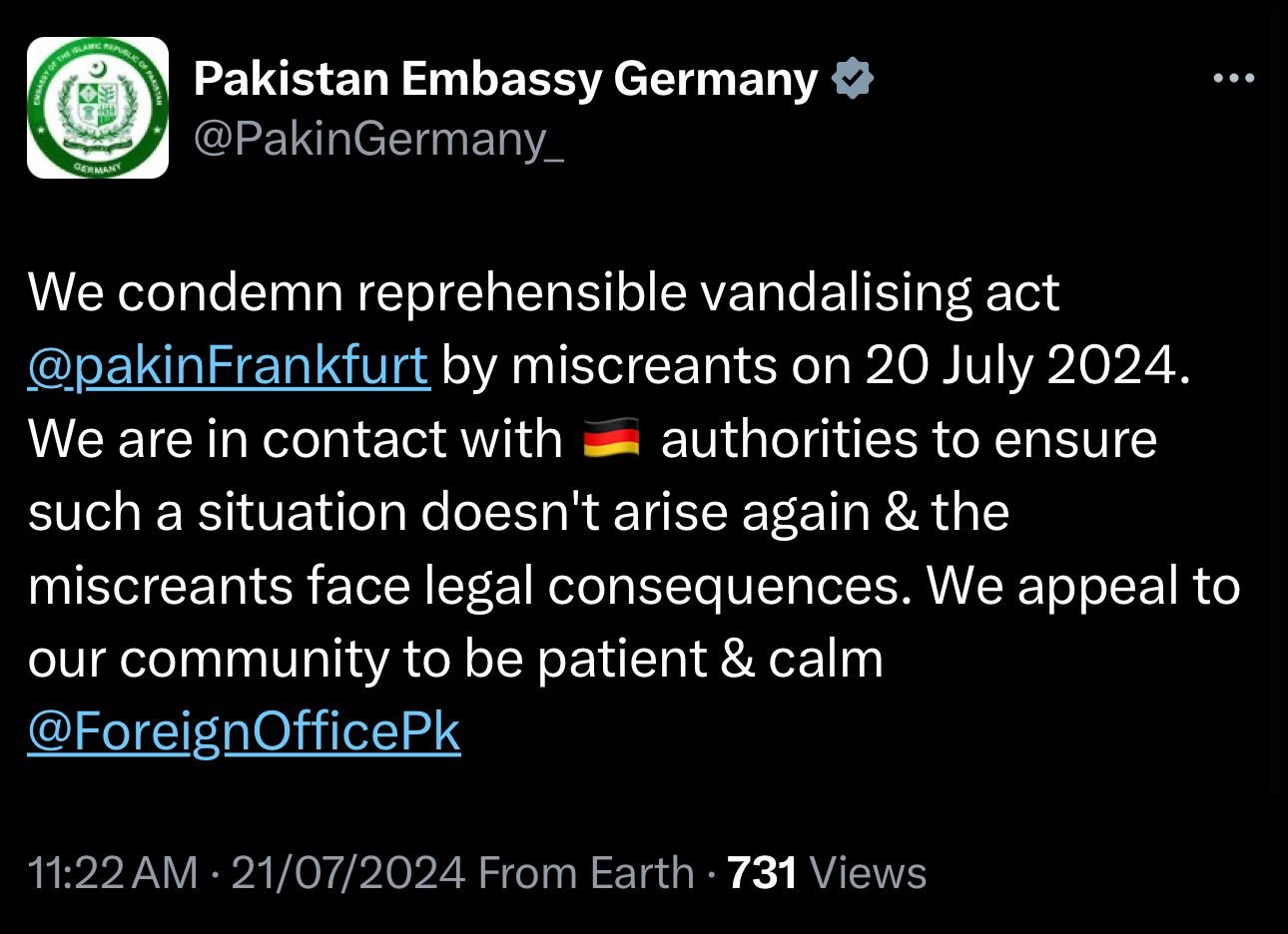 “We condemn the reprehensible vandalizing act @pakinFrankfurt by miscreants on 20 July 2024. We are in contact with authorities to ensure such a situation doesn’t arise again & the miscreants face legal consequences. We appeal to our community to be patient & calm,” it said in a social media post.