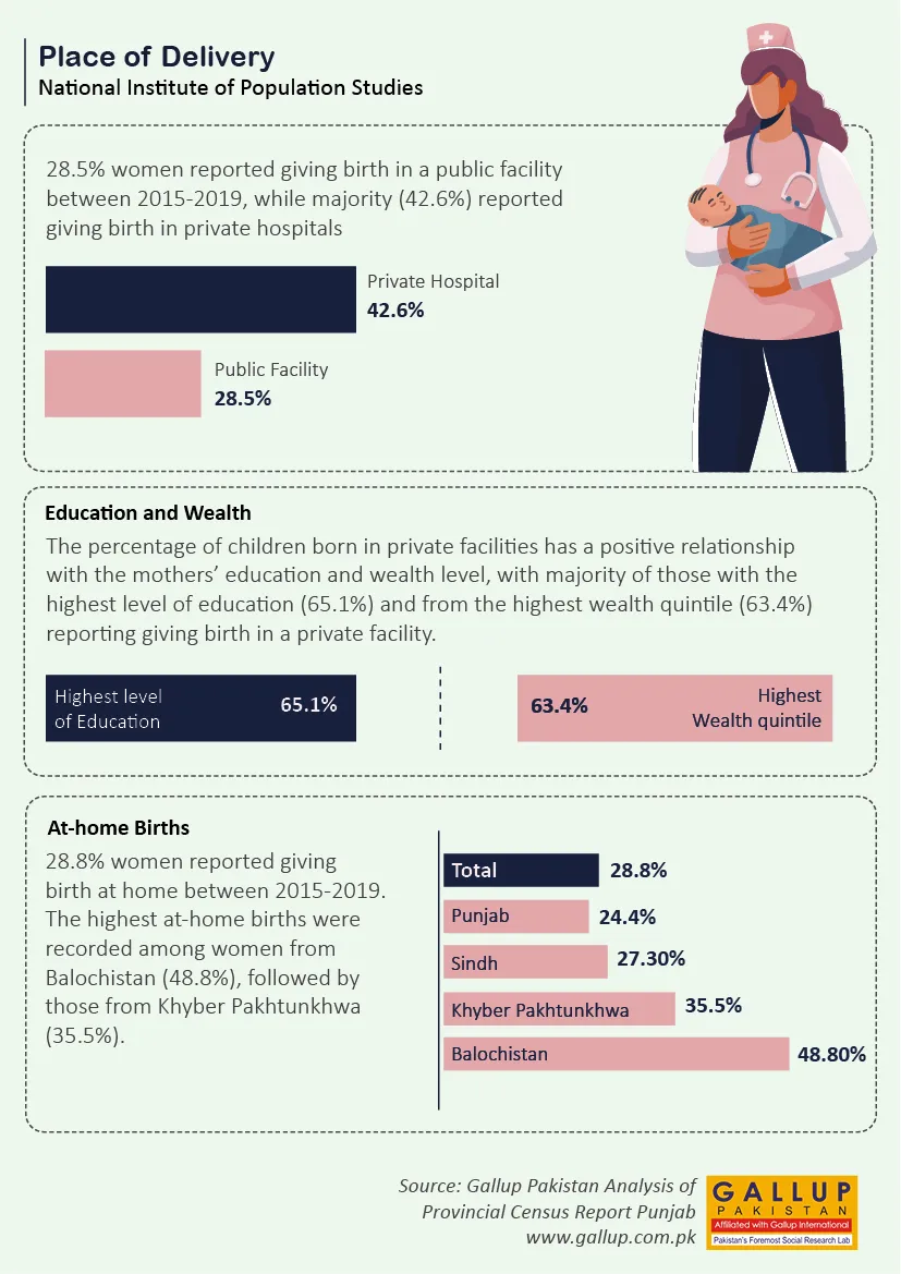 Gallup Pakistan, as part of its Big Data Analysis initiative, is looking at the place of delivery statistics among women in Pakistan. This data is part of a dashboard hosted by the ‘National Institute of Population Studies’.