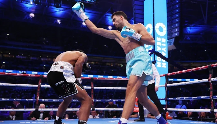 Sheeraz entirely eclipsed his British opponent at London’s Wembley Stadium on Saturday evening. The undefeated middleweight sent southpaw Denny to the canvas twice before overcoming him through technical knockout (TKO).