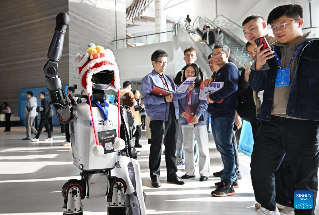 Participants look at a robot at the 2024 China Automation Congress exhibition area in Qingdao, east China’s Shandong Province, on November 2, 2024. The 2024 China Automation Congress, which focuses on the deep integration of automation and artificial intelligence and explores the innovative development of new industries and technologies, will last from Nov. 1 to 3 here. (Xinhua/Li Ziheng)
