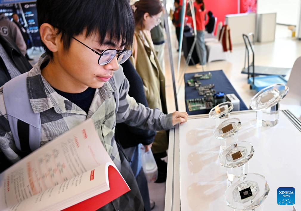 A participant looks at domestic chips at the exhibition area of the 2024 China Automation Congress in Qingdao, east China’s Shandong Province, Nov. 2, 2024. The 2024 China Automation Congress, which focuses on the deep integration of automation and artificial intelligence and explores the innovative development of new industries and technologies, would last from Nov. 1 to 3 here. (Xinhua/Li Ziheng)