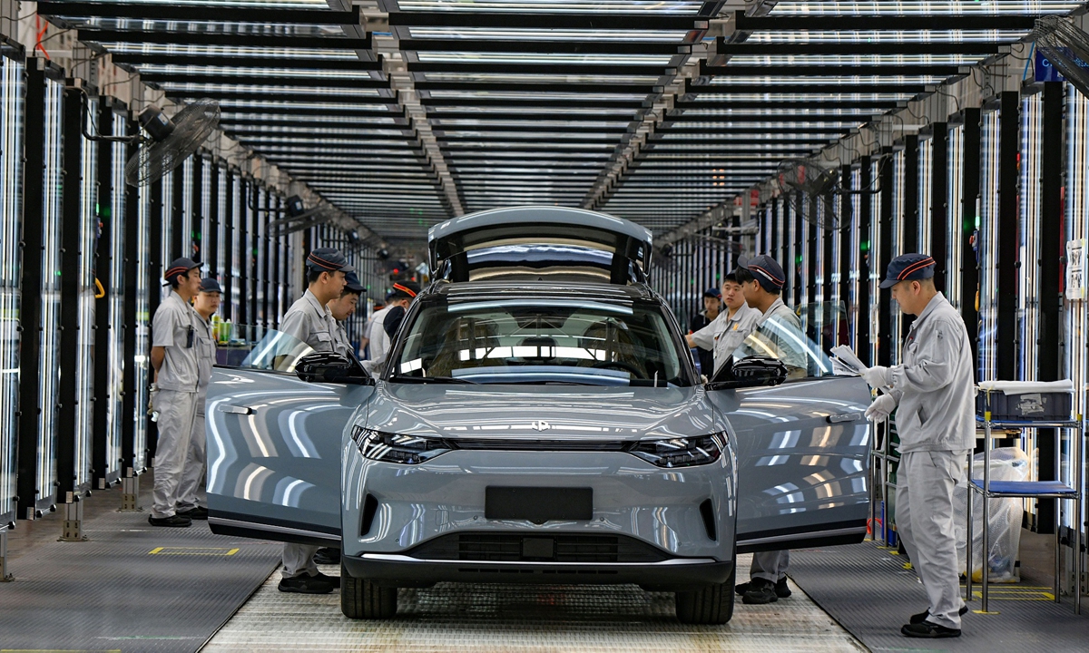 Workers complete assembling an electric vehicle (EV) at China’s EV start-up Leapmotor in Jinhua, East China’s Zhejiang Province on April…