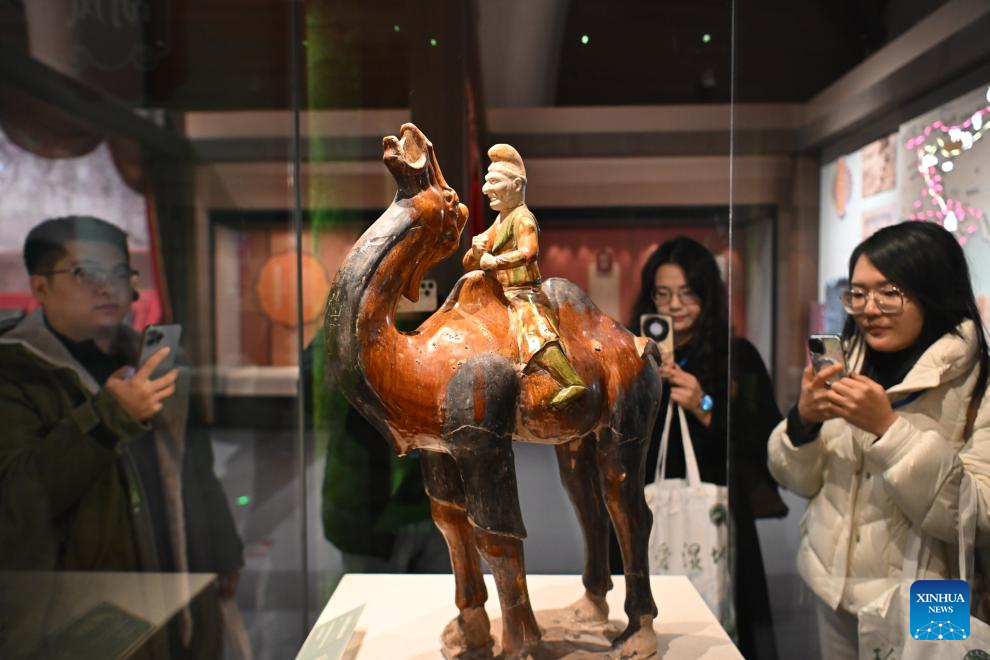 Visitors take photos of a tri-colored glazed pottery work, which depicts a nomadic camel rider, at National Maritime Museum of…
