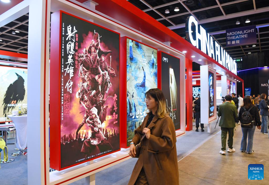 People view the joint exhibition booth of Chinese films at the Hong Kong International Film and TV Market (FILMART) in…