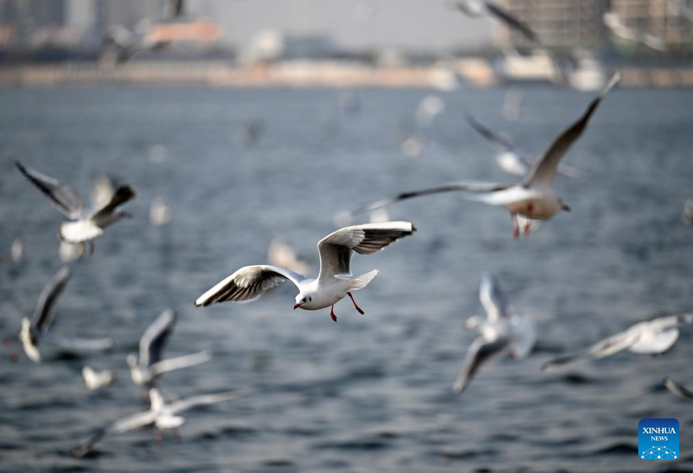 People view seagulls by the Haihe River in north China’s Tianjin Municipality, Nov. 19, 2024. Thousands of seagulls have recently…