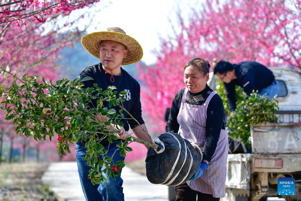 Wu Guangrong feeds chickens at the ecological park in Longli County, southwest China’s Guizhou Province, March 11, 2025. Wu Guangrong,…