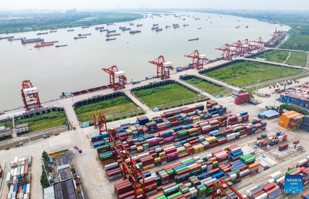 A staff member conducts inspection of the first train of the “Zheng He” Sea-Road-Rail International Multimodal Transport Service at Tengjun…