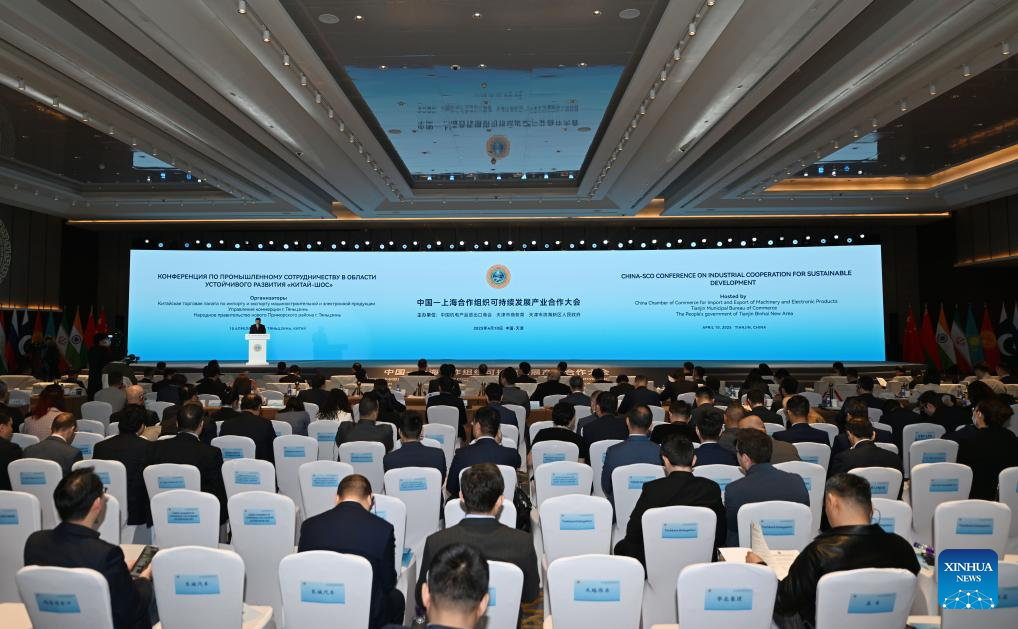 Guests attend a signing ceremony during the China-SCO Conference on Industrial Cooperation for Sustainable Development in north China’s Tianjin, April…