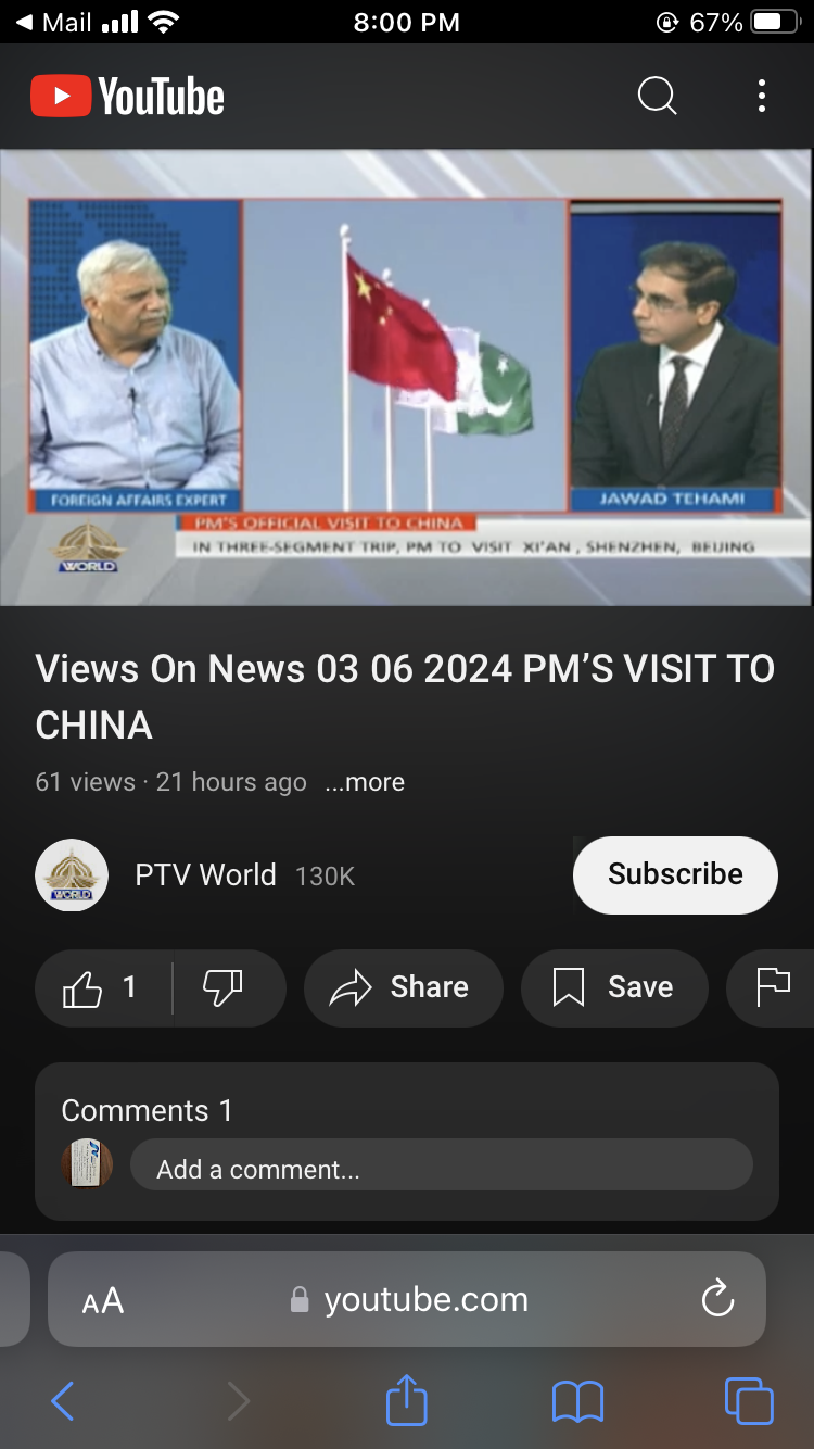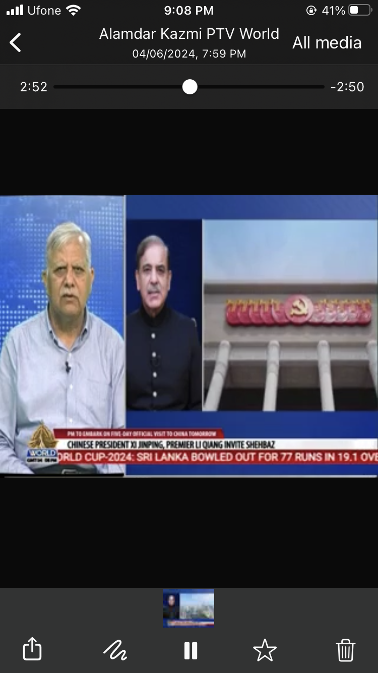 Kindly watch my views on PTV World News at 9 PM on 03 June 2024 PM’s China Visit https://www.facebook.com/561225975/posts/pfbid0GsgW5XVVrLtc459SYzQbGW1joy4sSh21G92P3ynuK9zNv4tnfWzYqgp8vgwmdXtRl/?mibextid=adzO7l Reference…