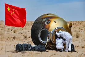 Astronauts Cai Xuzhe (C), Song Lingdong (R) and Wang Haoze from China’s Shenzhou-19 crewed mission salute during a press conference…