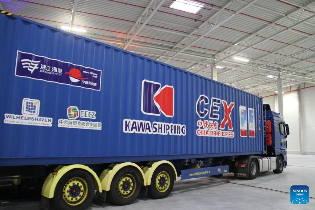 People attend a ceremony marking the completion of the maiden voyage of the first “China-Europe Express” container ship in Wilhelmshaven,…