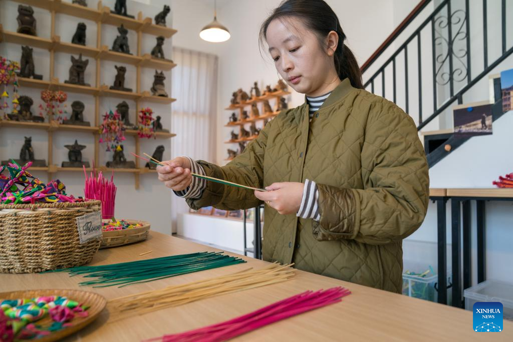 Yang Jie sorts out straws at her studio in Kunming, southwest China’s Yunnan Province, Jan. 25, 2025. The art of…