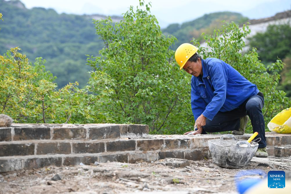 A worker repairs a wall near a defense tower of the Jiankou section of the Great Wall in Beijing, capital…