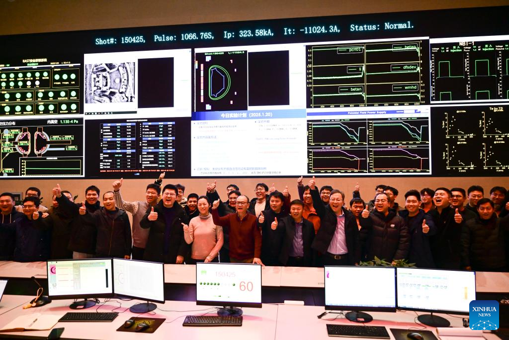 Members of division of the Experimental Advanced Superconducting Tokamak (EAST) Physics and Experimental Operations celebrate the success of an experiment…