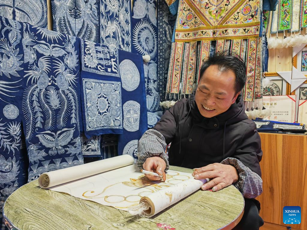 Miao ethnic craftsman Wan Yuan makes batik at an intangible heritage market in the city of Kaili in Qiandongnan Miao…