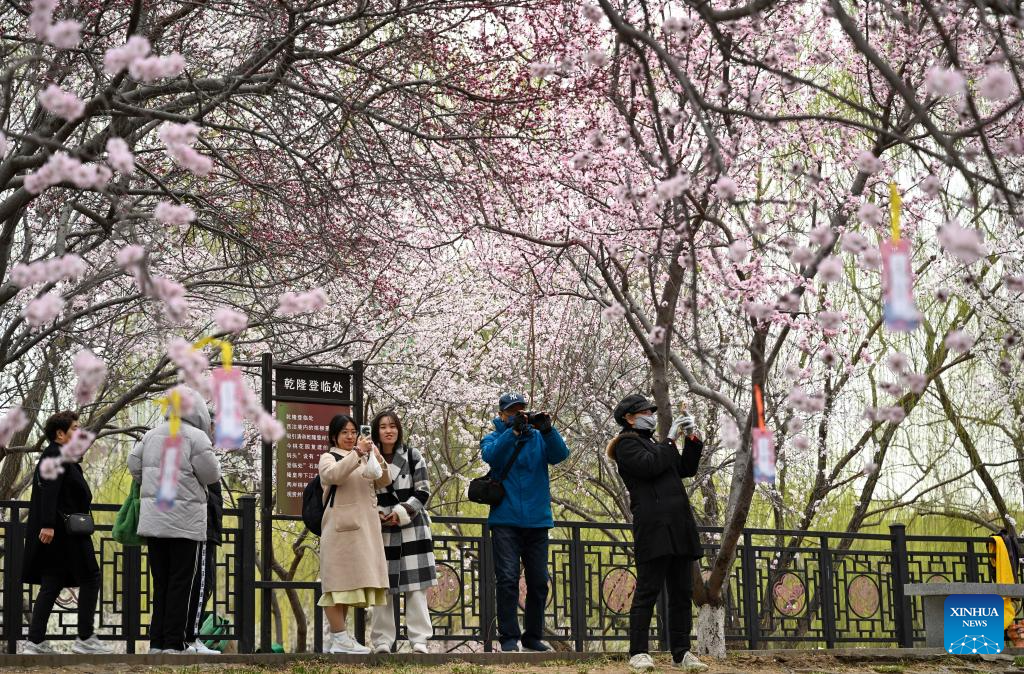 People enjoy peach blossoms along the banks of a canal in Hongqiao District of north China’s Tianjin Municipality, March 15,…