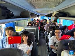Chinese citizens evacuated from Israel board a bus to leave, at the Taba border crossing in Egypt’s South Sinai province,…