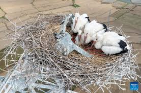 An aerial drone photo taken on May 21, 2025 shows oriental white storks taking care of the nestlings on top…