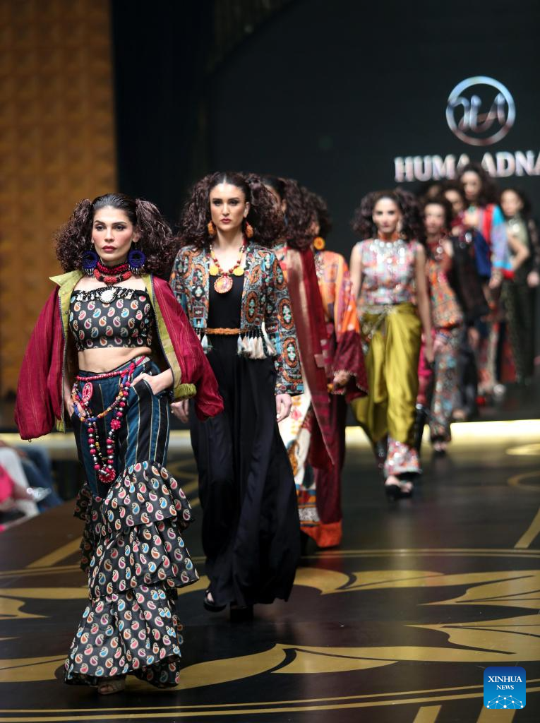 Models present creations during a fashion show in Karachi, Pakistan on Oct. 23, 2024. A model presents a creation during…