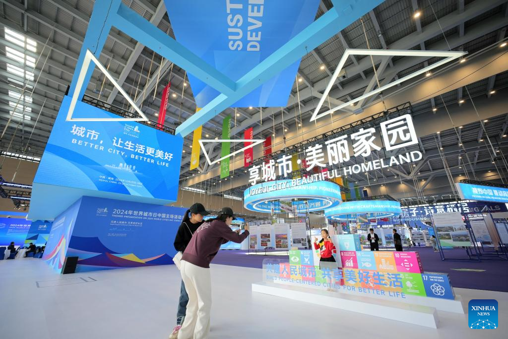 People visit an exhibition of the 2024 World Cities Day China Observance in Weihai, east China’s Shandong Province, Oct. 26,…