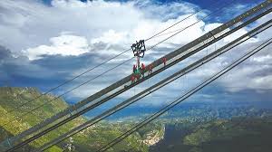 An aerial drone photo taken on July 22, 2025 shows a tourist playing a “super giant swing” in a giant…