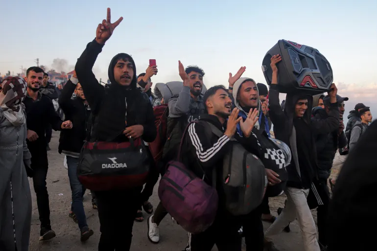 Thousands of Palestinians head on foot to what is left of their homes after 15 months of war and forced…