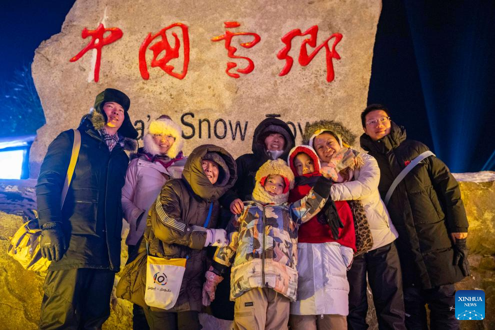 People pose for photos at China’s “Snow Town” scenic spot in Mudanjiang, northeast China’s Heilongjiang Province, Jan. 24, 2025. Located…