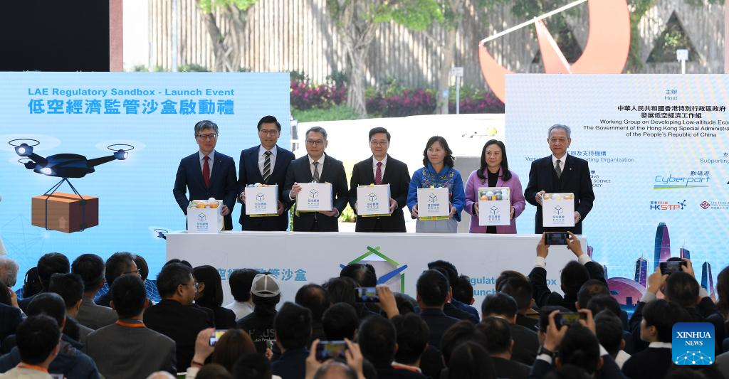 Guests attend the launching ceremony of the first batch of low-altitude economy (LAE) regulatory sandbox pilot projects held in Hong…