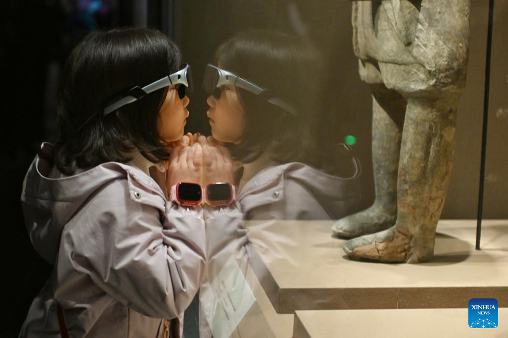 A child using augmented reality (AR) glasses visits the Chengdu Museum during the Spring Festival holiday in Chengdu, southwest China’s…
