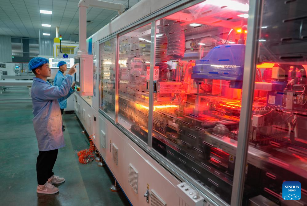 Staff members process photovoltaic products at an industrial park in Tongxin County of Wuzhong, northwest China’s Ningxia Hui Autonomous Region,…