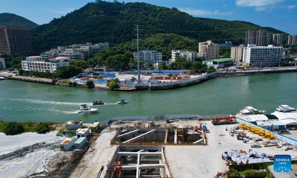 A drone photo shows the construction site of the Sanya River estuary passage project in Sanya, south China’s Hainan Province,…