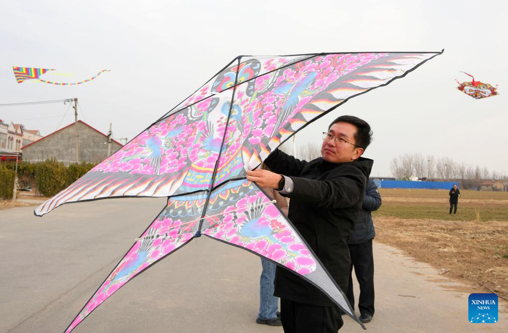 Staff members check kite parcels at a kite making company in Wangjiazhuangzi Village of Fangzi District in Weifang City, east…