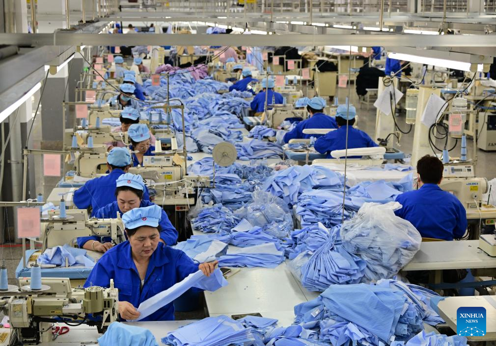 A staff member of a garment enterprise in an industrial park trains workers on new equipment and skills in Jimo…